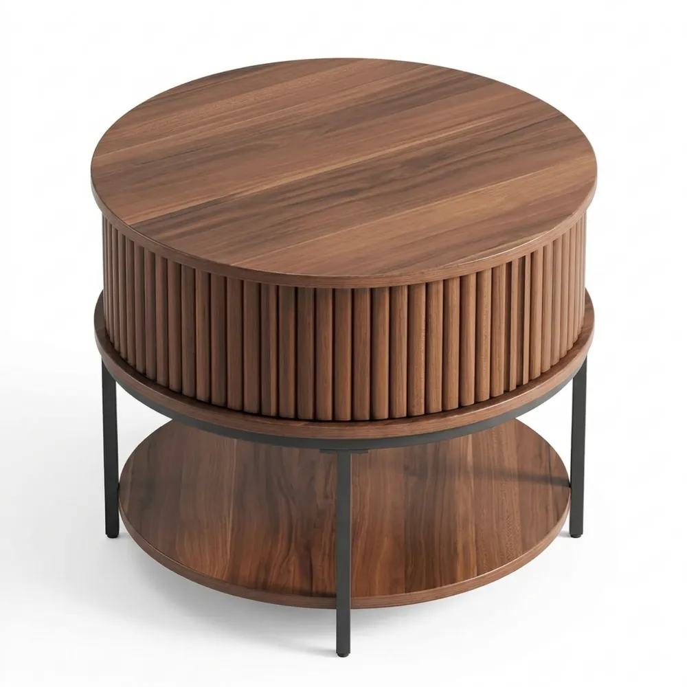 Beschreibung: Dieser runde Holz-Beistelltisch mit Rillenoptik kombiniert natürlichen Charme mit praktischem Stauraum für Ihr Wohnzimmer.