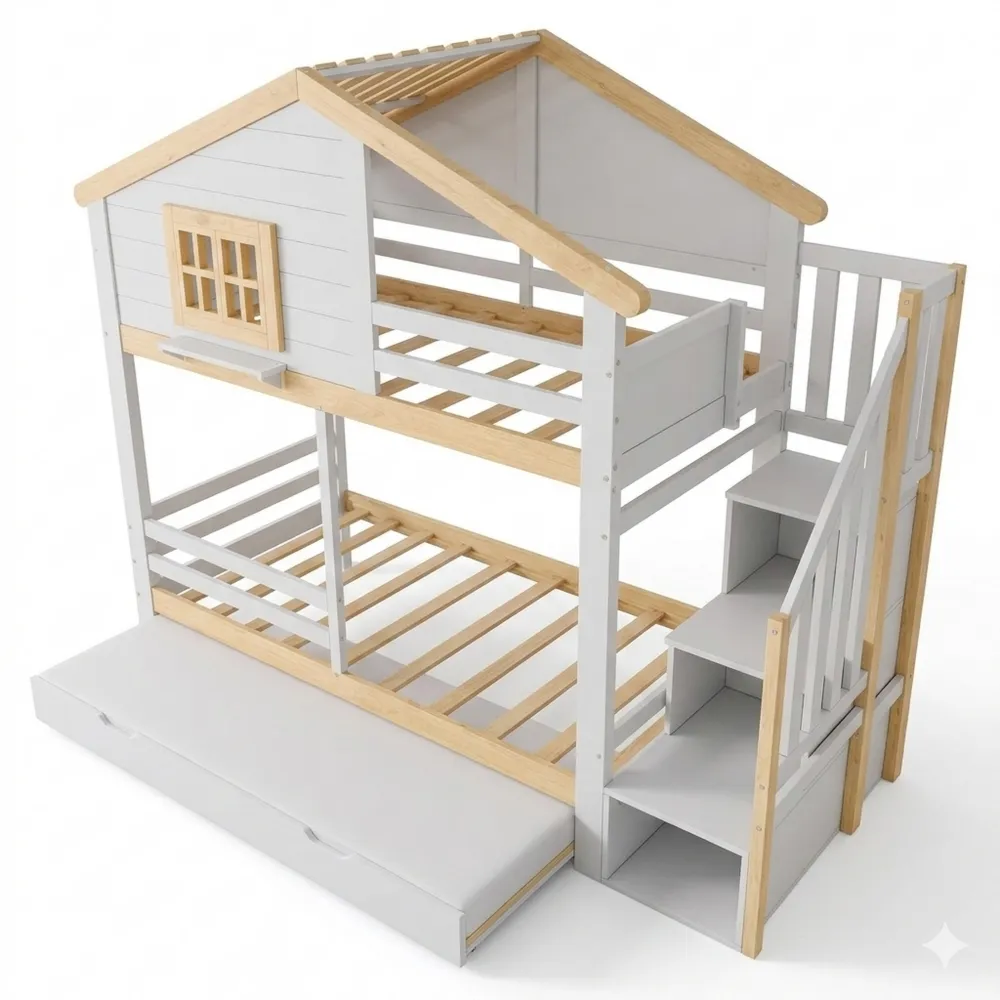 Blockhütten-Stil mit Zaun oben, fördert kindliche Fantasie. Ausziehbares Bett bietet zusätzliche Schlafmöglichkeiten. Unter der Treppe gibt es Ablagefächer für einfachen Stauraum. Rund um das obere Bett gibt es Geländer für zusätzliche Sicherheit. Details zur Installation sind vorhanden.