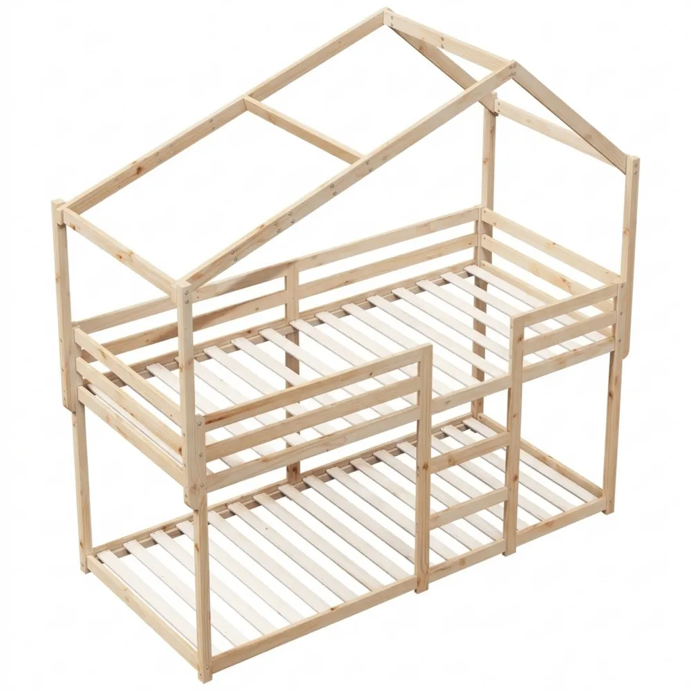 Dieses Kinder-Etagenbett mit Dach bietet eine funktionale Lösung für Räume mit begrenztem Platzangebot. Kiefernholz verleiht ihm eine natürliche Optik mit charakteristischer Maserung. Das Bett ist mit Leitplanken ausgestattet, um Sicherheit während des Schlafens zu gewährleisten. Sperrholzlatten sorgen für eine gleichmäßige Gewichtsverteilung und Unterstützung der Matratze. Das Dachgestell schafft einen einladenden Rückzugsort für Kinder.